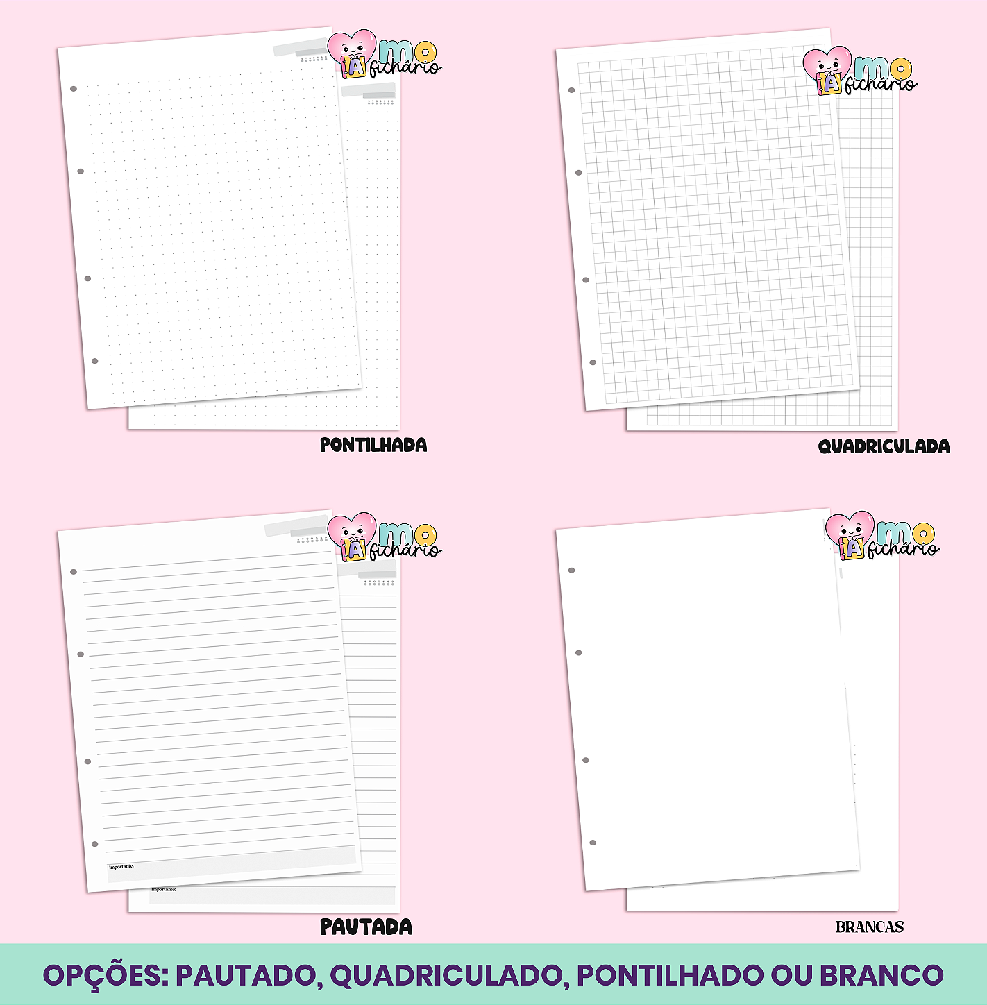 • Opções de folhas: Pautado,Quadriculado, Pontilhado ou Branco
